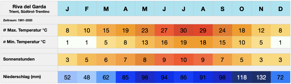 - Zivilschutz der Autonomen Provinz Trient – Abteilung Klima: Mittlere Maximum und Minimum Temperaturen; Maximum und Minimum Temperaturen – Extremwerte; Monatliche und Jährliche Mittelwerte der Temperatur.(PDF-Links) Wetterstation Torbole. Zivilschutz der autonomen Provinz Trient, abgerufen am 28. Juni 2017 (italienisch). Monatliche und jährliche Niederschlagsmengen; Anzahl der monatlichen und jährlichen Niederschlagstage.(PDF-Links) Wetterstation Torbole. Zivilschutz der Autonomen Provinz Trient, abgerufen am 28. Juni 2017(italienisch). ↩︎