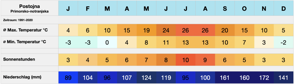 - „Postojna Podnebne statistike 1950-2020“ (in Slovenian). Slovenian Environmental Agency. Archived from the original on 24 October 2023. Retrieved 24 October 2023. ↩︎