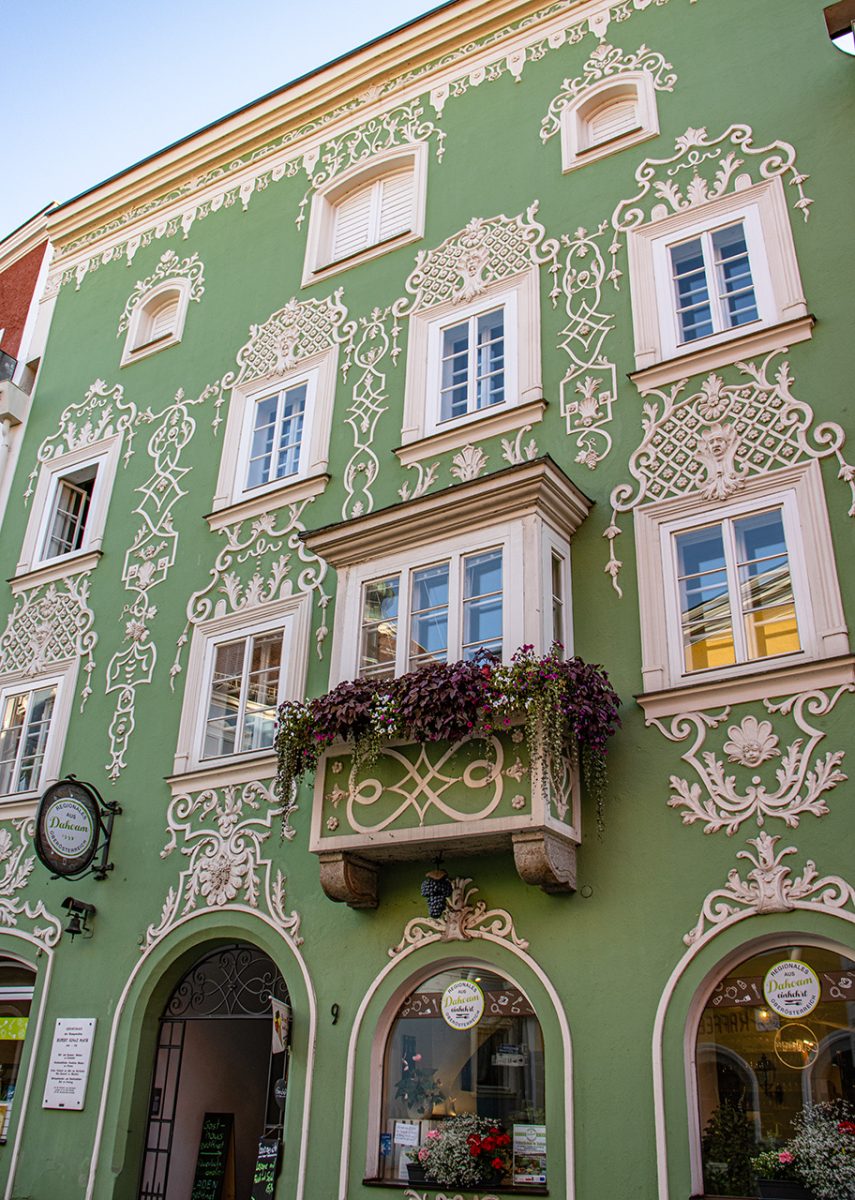 Das Herz von Schärding ist der zentrale Stadtplatz, der von den berĂĽhmten „Silberzeile“-Häusern umgeben ist. Diese Häuserfronten sind ein herausragendes Beispiel fĂĽr den Inn-Salzach-Baustil, der sich durch die charakteristischen Giebel und die bunten Fassaden auszeichnet. Der Name „Silberzeile“ geht auf die wohlhabenden Kaufleute zurĂĽck, die hier im Barock ihre Häuser mit aufwendigen Verzierungen schmĂĽckten. Die lebendige Farbgebung der Häuserfronten macht den Platz zu einem beliebten Fotomotiv.
