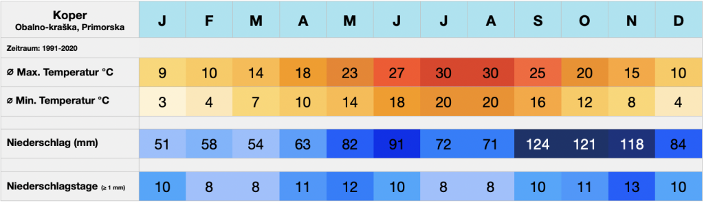 - „Koper Podnebne statistike 1950-2020“ (in Slovenian). Slovenian Environmental Agency. Archived from the original on 24 October 2023. Retrieved 24 October 2023. ↩︎